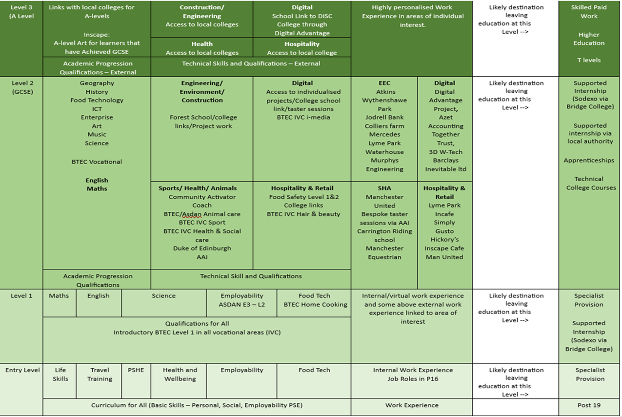 When considering options for P16 such as transitioning out of the school or transitioning to Inscape or through the school it is important to consider if your child transitions to P16 Cheadle or Inscape’s Vocational College based in Ashton where learners can focus on BTEC vocational qualifications, this can be discussed at your child’s annual review.