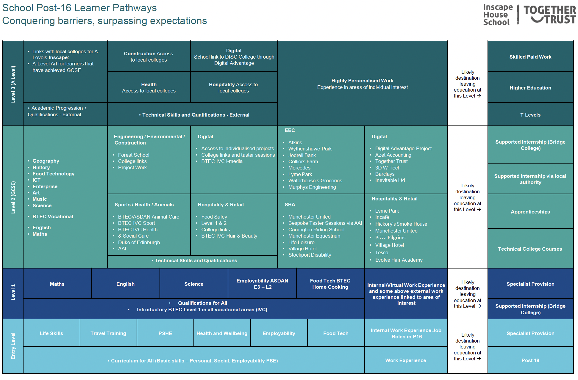 Post-16 Adventurers and Pioneers at Inscape Cheadle and Inscape Vocational College follow pathways that develop the skills, qualifications and knowledge needed for their chosen route into adulthood and employment. The pathway document below is shared with students and parents/carers as part of the review process to clarify future requirements and to support informed decision-making. By aligning learning with each student’s aspirations, we help them prepare confidently for successful transitions into work, training or further education.
