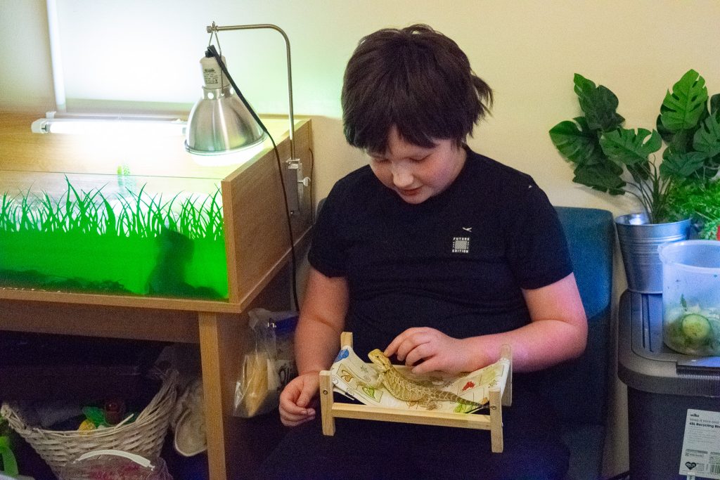 Stitch was recently acquired with help from kind donations from supporters of the Together Trust. He is a feisty bearded dragon that enjoys lounging under the heat lamp in his deck chair, snacking on tasty crickets and meeting new friends. Ran by our award-winning practitioner, Danielle, Animal Assisted Intervention brings students from Inscape House School and Ashcroft School in contact with friendly animals in order to improve students’ mental, physical, social and emotional functioning.
