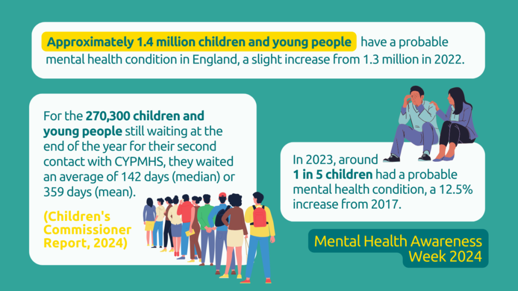- For the 270,300 children and young people still waiting at the end of the year for their second contact with CYPMHS, they waited an average of 142 days (median) or 359 days (mean) (Children’s Commissioner Report, 2024).