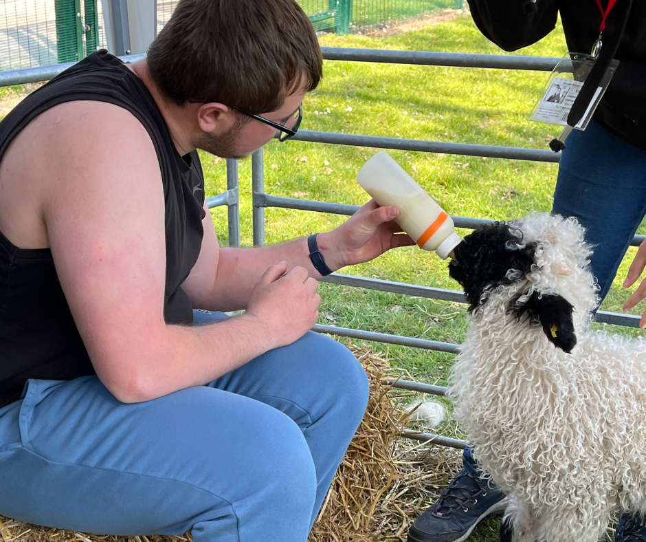 Milo, the black-and-white lamb, is pure Valais blacknose who was born on 13th February, but despite his young age he is a perfect playmate for young people. He was adopted by Ewenique after his mum rejected him, which means he is being raised with a bottle. This was a perfect opportunity for our Animal Care students to practice feeding the lamb with bottles, an important learning experience for their qualification.